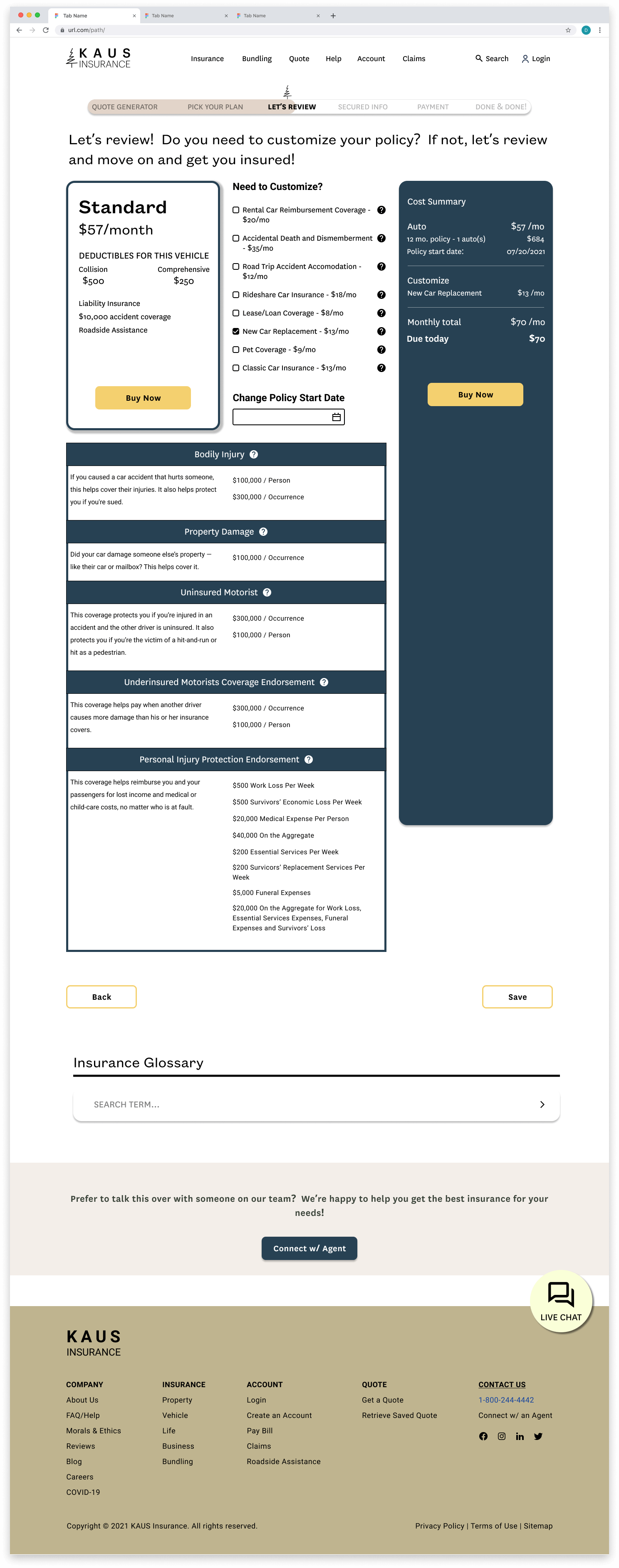But today, KAUS is falling behind its competitors because of its lack of a direct to consumer options for their users, specifically for their younger demographics. My job was to create a design that allowed easy access to insurance for younger demographics.