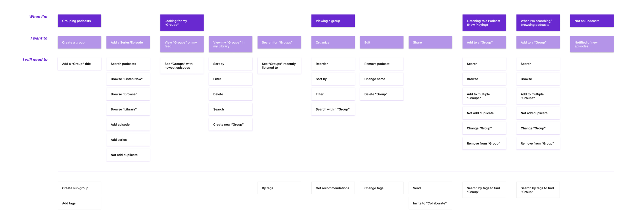 This process allowed me to take my user stories and map out what specific features/capabilities/additions would be needed to achieve the user’s goal.