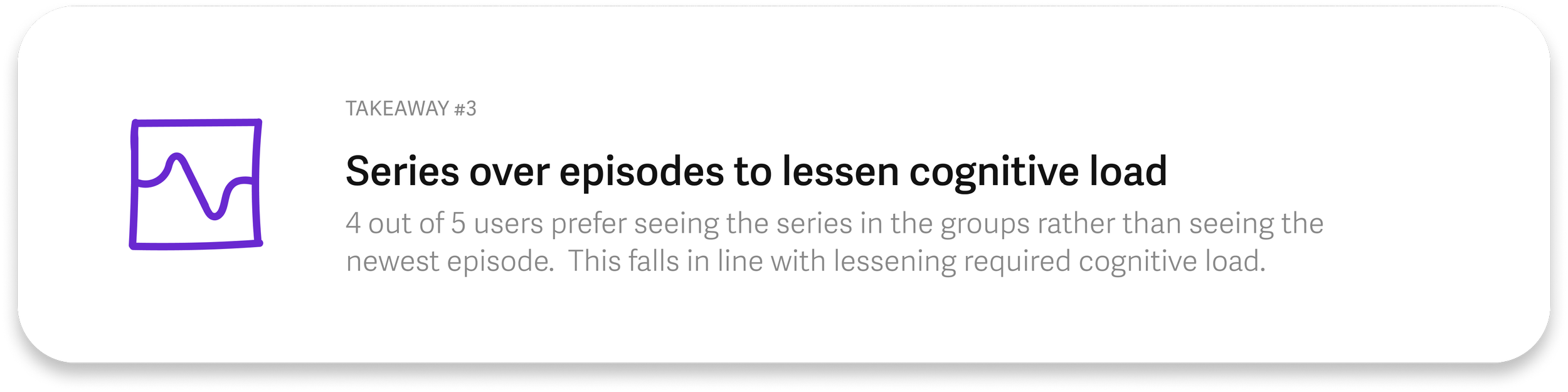 Based on my User Research, I found that users were wanting to get to the series that they listen to faster. Because of that, I wanted to allow easy access to those throughout their process. I wanted to avoid forcing the user to have to click into multiple different pages to get to their “go-to” series.