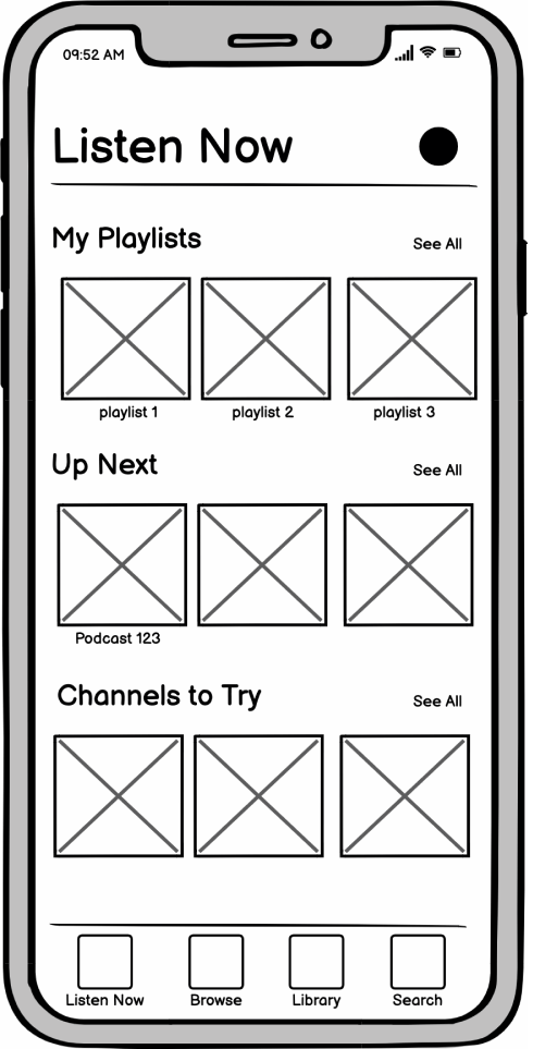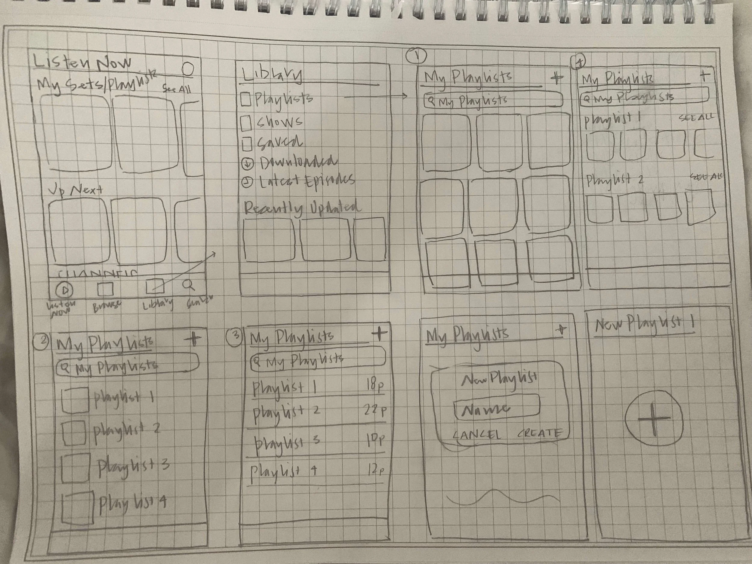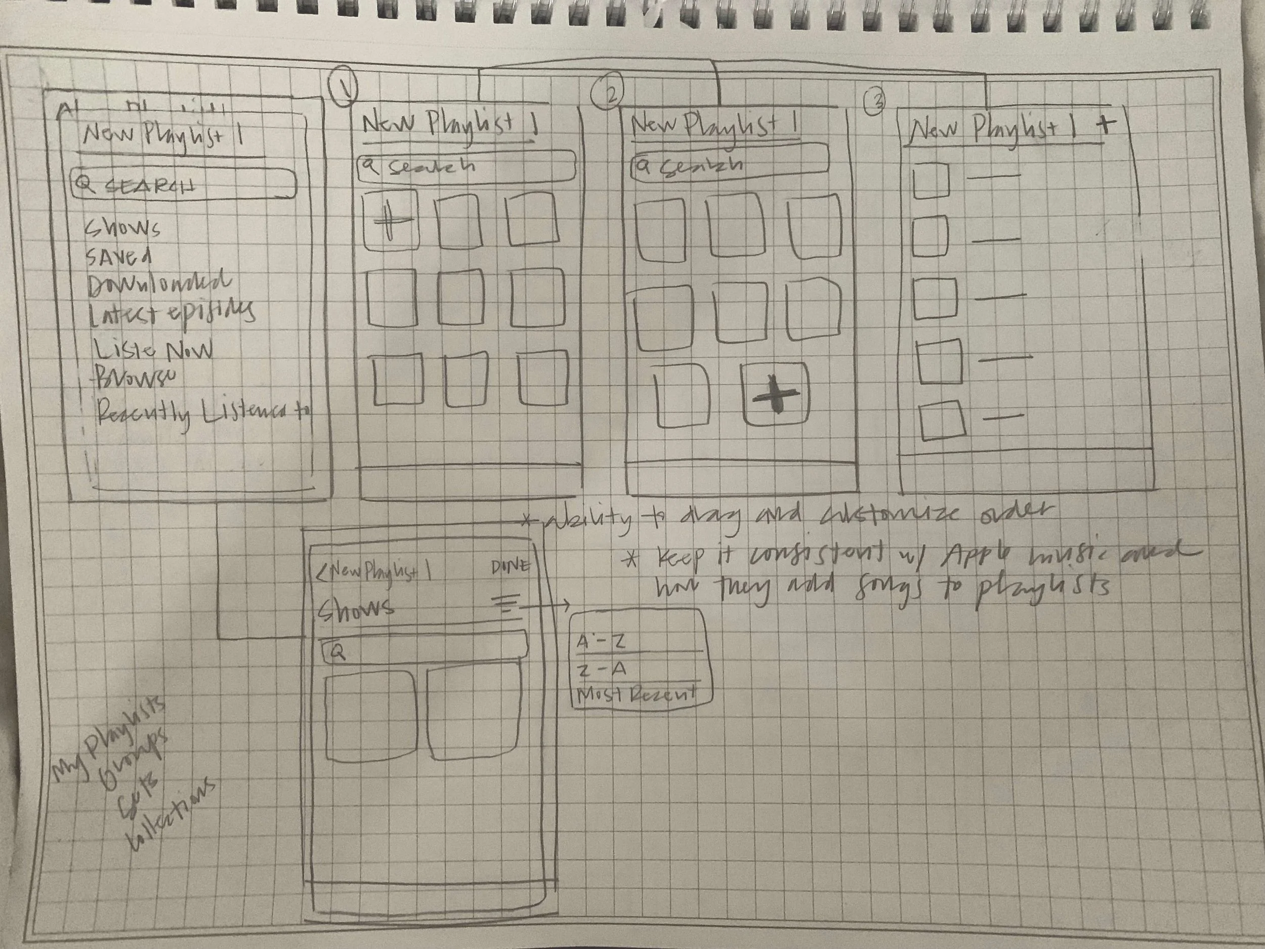 Having defined the problem, now it was to the drawing board. Although this should be a time of exploring possible solutions, I decided to try to stay in line with other Apple products, like Apple Music. I based much of the layout on their playlists.